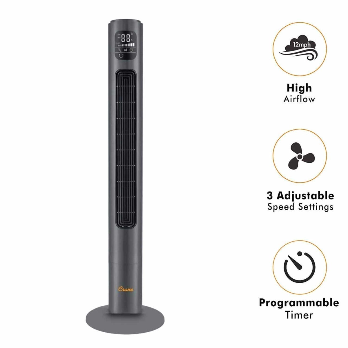 Crane Digital LED Display Tower Fan with remote, Timer and Powerful Motor - Grey
