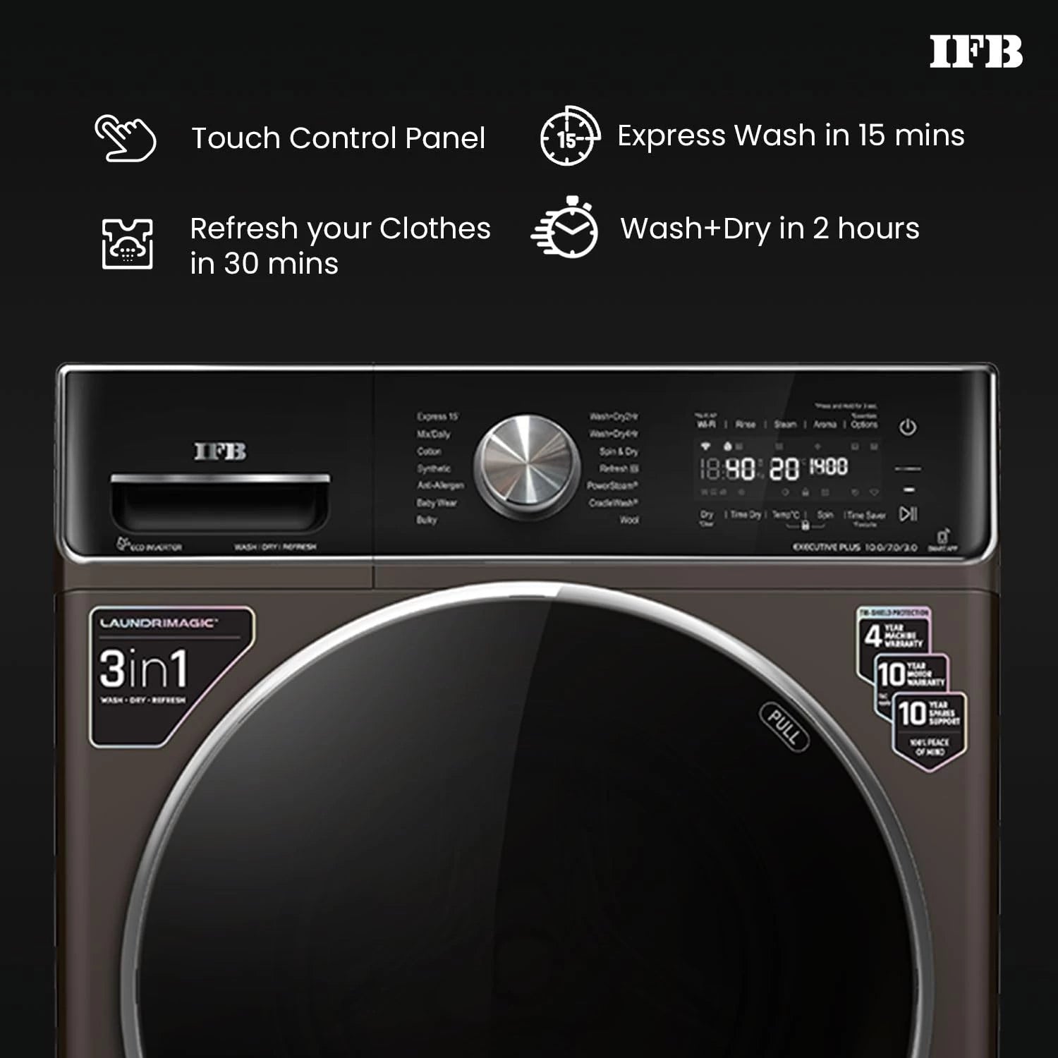 IFB 10 Kg/7 Kg/3 Kg 3-in-1, AI Powered, Fully Automatic Washer Dryer Refresher (IFB Laundrimagic®, EXECUTIVE PLUS ZXM, 9 Swirl Wash, Eco Inverter Technology, Mocha)