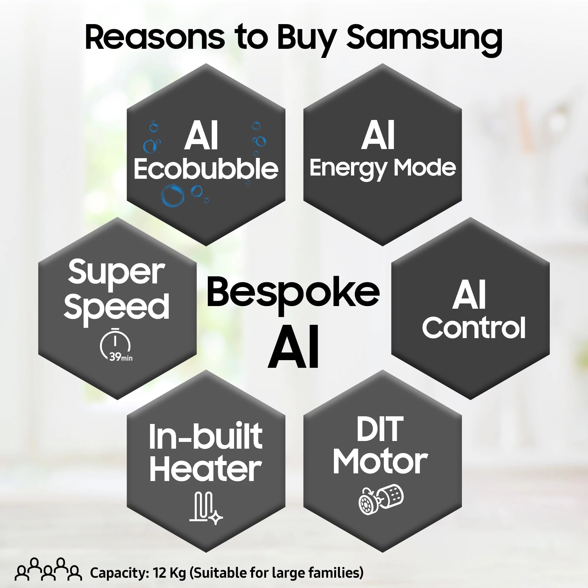 Samsung 12 kg, 5 Star, AI Control, Super Speed, Wi-Fi, Hygiene Steam with Inbuilt Heater, Digital Inverter, Fully-Automatic Front Load Washing Machine (WW12DB7B24GBTL, Black)