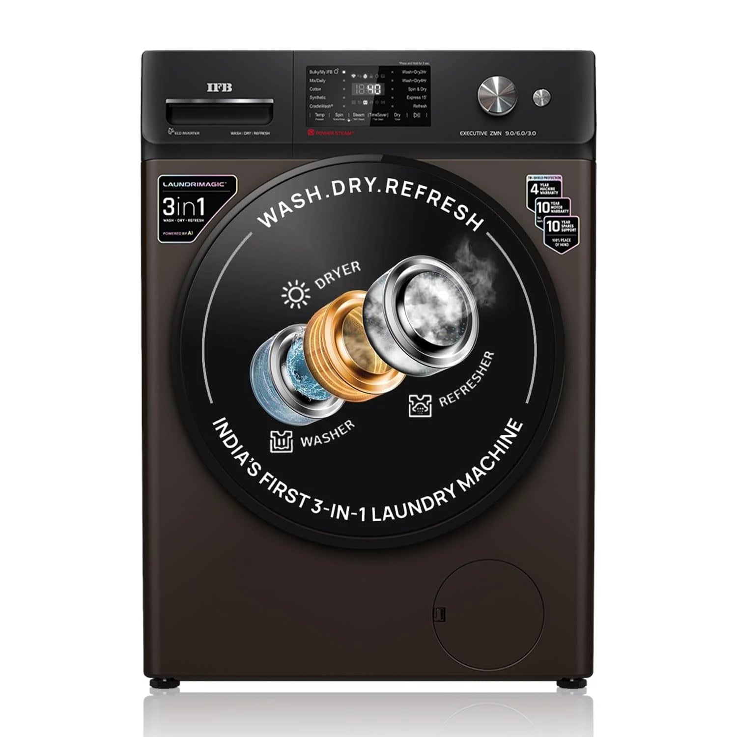 IFB 9/6/3 kg Fully Automatic Washer Dryer Refresher with Steam Refresh, AI Powered, 100% Dry Clothes, 9 Swirl Wash Mimic Handwashing, WiFi & Eco Inverter Motor (WDR Executive ZMN, Mocha)