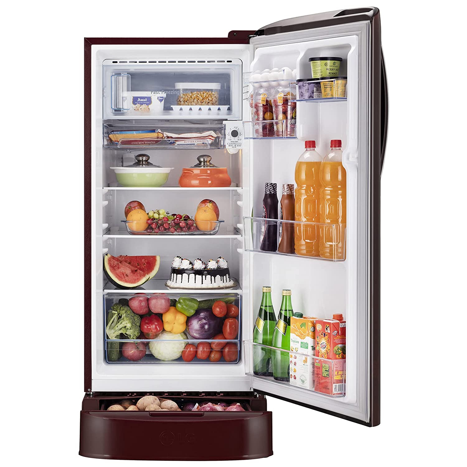 LG 201 L 5 Star Inverter Direct-Cool Single Door Refrigerator (GL-D211HSEZ, Scarlet Euphoria, Base stand with drawer, Gross Volume- 204 L)