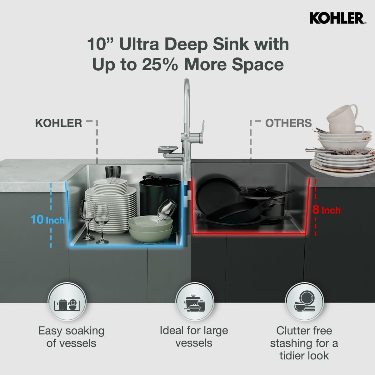 Kohler Strive™ Kitchen Sink with Lifetime Warranty|1.2 mm Thick Stainless Steel Double Equal Bowl with SilentShield™|10" Deep, Round Corners for Easy Cleaning | 45x20x10 inches, Brushed Matte Steel